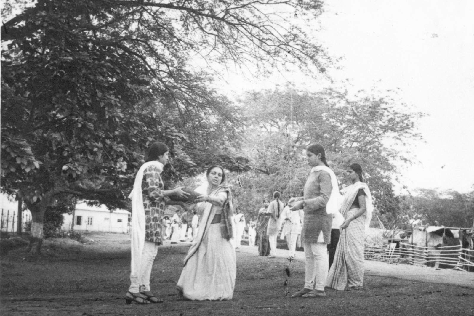 The Ethos of Labor (1970): Dr. Sushila Nayar leads the second batch of MGIMS students in Shramdan. Pictured (L-R) are Shivani Bhargava, Mangala Bansod, and Dr. Nayar passing a tokri to Meenakshi Kanitkar. In the distance is Prabhleen Gill.
